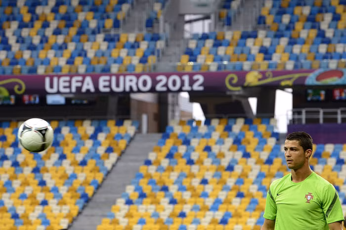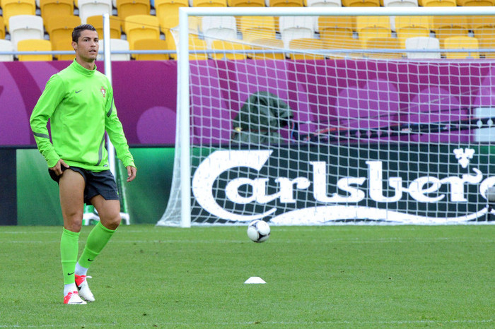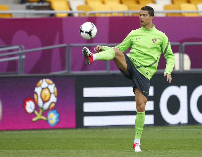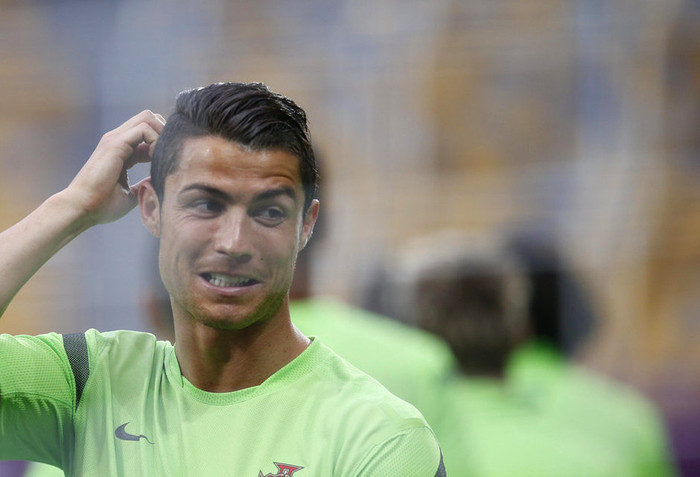 | Cristiano Ronaldo trông rất lãng tử với mái tóc bóng mượt rất lạ khi xuất hiện trong cuộc họp báo trước trận đấu giữa Bồ Đào Nha và Đức tại sân Arena Lviv, Ukraine, vào đêm nay |