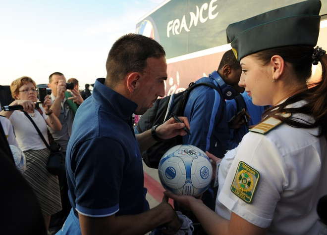 | Các thành viên của Les Bleus tranh thủ ký tặng các tiếp viên |