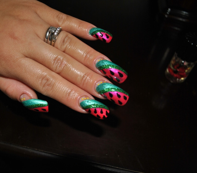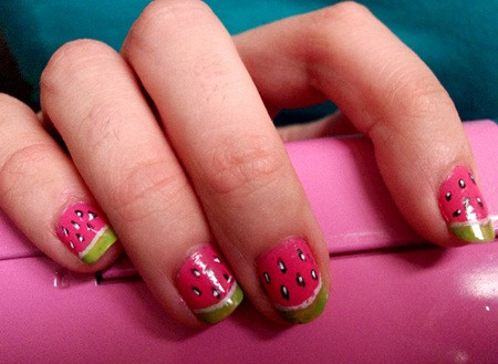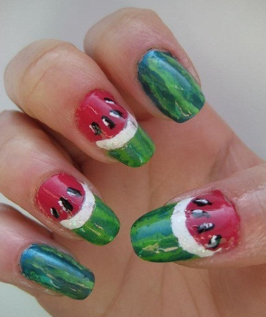 | Các thiết kế móng tay với họa tiết dưa hấu tạo cho móng tay của bạn sự tinh tế và chân thực. |