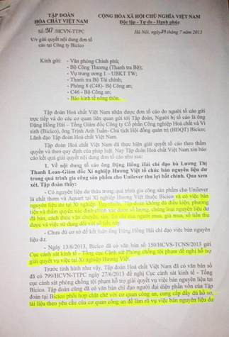 Trong Công văn số 917/HCVN-TTPC ngày 24/7/2013, Tập đoàn Hóa chất lần đầu tiên thừa nhận: Có nguyên liệu dư thừa trong quá trình gia công sản phẩm cho Unilever là chất thơm và Aquart tại Xí nghiệp Hương Việt thuộc Bicico và có việc bán nguyên liệu dư tại xí nghiệp. Tuy nhiên, Tập đoàn không đủ điều kiện, phương tiện và thẩm quyền xác định chính xác được số lượng, chủng loại nguyên liệu dư đã bán, cách thức vận chuyển, tên, địa chỉ của người mua, giá mua, số tiền thu được và việc sử dụng đối với số tiền này.