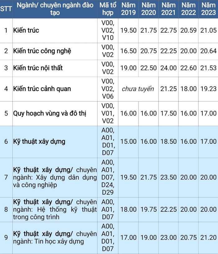 Năm 2020 và năm 2021, ngành Kiến trúc có 250 chỉ tiêu, năm 2022 có 270 chỉ tiêu và năm 2023 tăng lên 300 chỉ tiêu.
