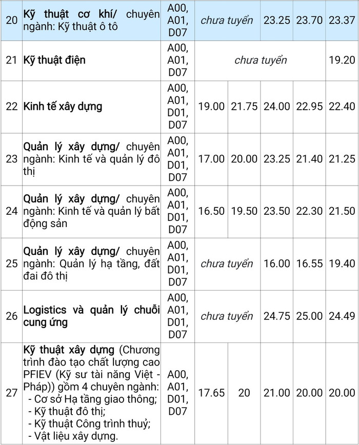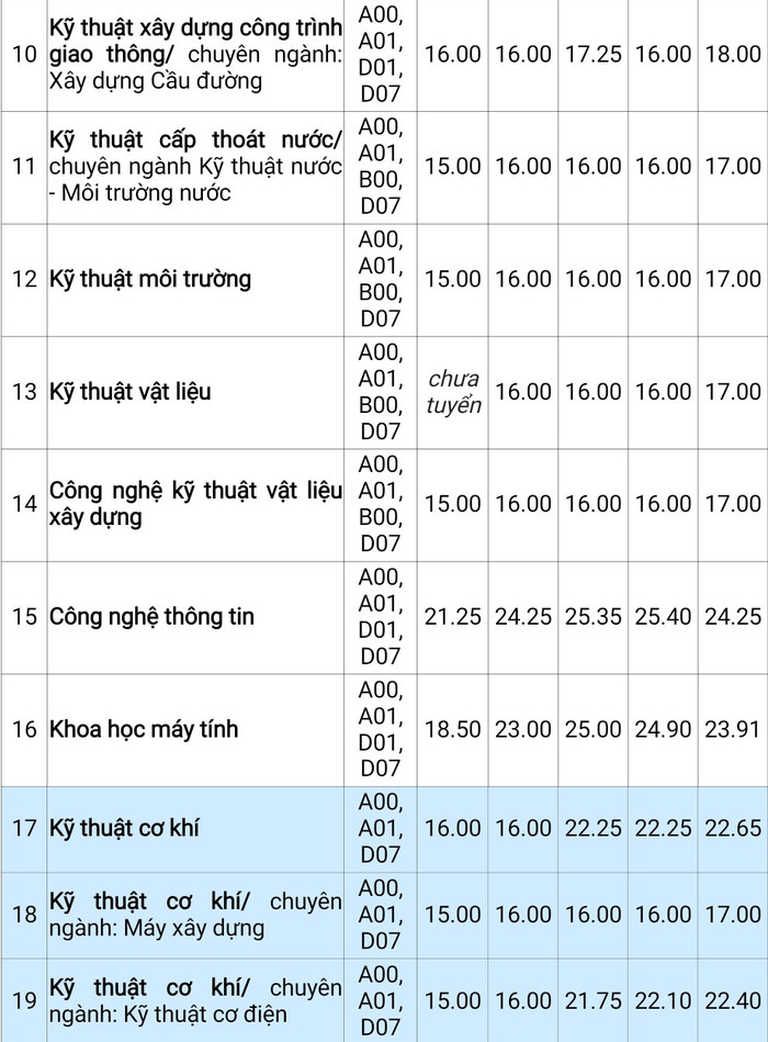 Điểm chuẩn của trường Đại học Xây dựng Hà Nội năm gần đây nhất dao động trong khoảng từ 17 đến 24,49. Trong đó, có những ngành lấy điểm chuẩn thấp nhất là 17 điểm.