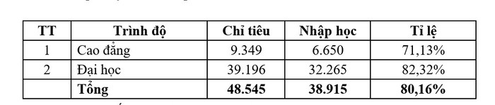 Trong số 330 cơ sở đào tạo, có 194 cơ sở đào tạo (58,67%) có tỉ lệ nhập học đạt trên trên 80% so với chỉ tiêu và chiếm 79,42% tổng số nhập học của toàn quốc.