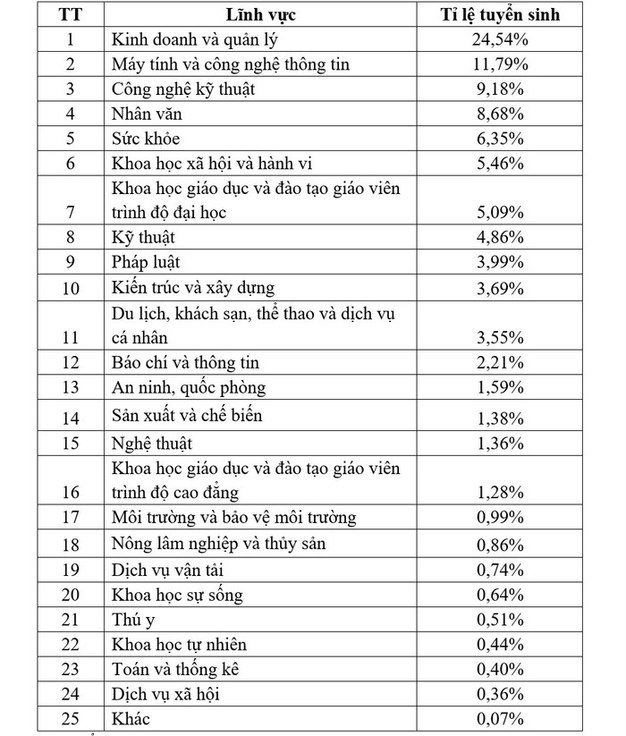 Tỷ lệ tuyển sinh theo các lĩnh vực đào tạo như sau: