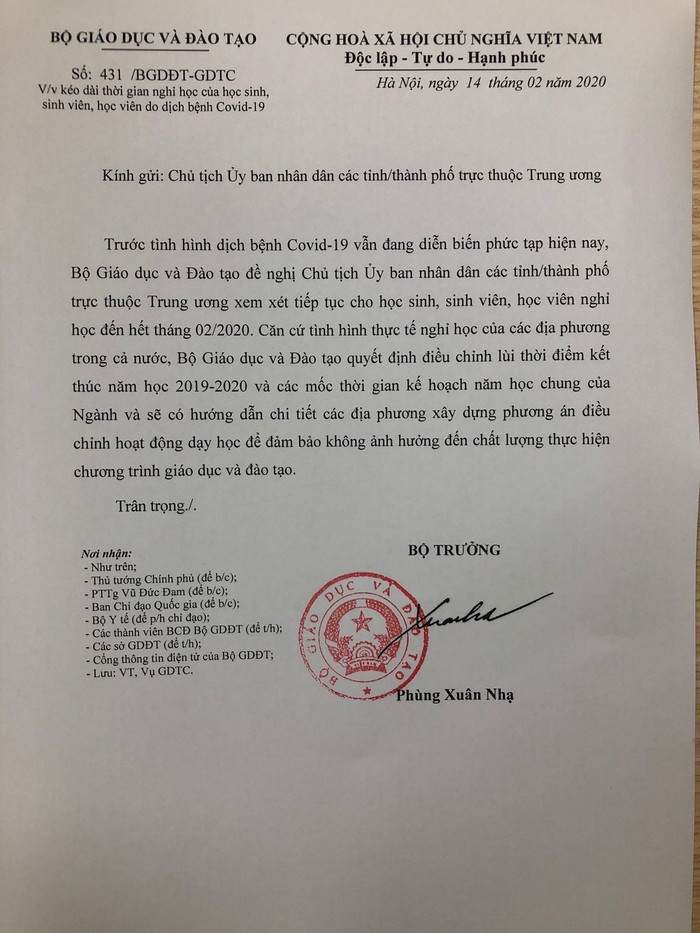 Bộ trưởng Bộ Giáo dục và Đào tạo Phùng Xuân Nhạ đã có công văn hỏa tốc gửi Chủ tịch Ủy ban nhân dân các tỉnh/thành phố trực thuộc Trung ương đề nghị kéo dài thời gian nghỉ học của học sinh, sinh viên, học viện do dịch bệnh Covid-19.