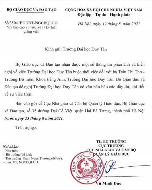 Trước một số phản ánh về việc Trường Đại học Duy Tân buộc thôi việc đối với bà Trần Thị Thơ - Trưởng Bộ môn, Khoa tiếng Anh, Trường Đại học Duy Tân chưa thỏa đáng, Bộ Giáo dục và Đào tạo đã có văn bản yêu cầu Trường Đại học Duy Tân báo cáo đầy đủ, chi tiết về sự việc.