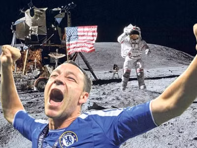 | Loạt ảnh chế bắt đầu, Terry ăn mừng trên mặt trăng với phi hành gia Neil Armstrong. |