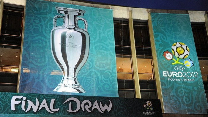 | Chiếc cúp EURO làm bằng băng đặt bên ngoài Cung nghệ thuật Kiev ở thủ đô Kiev (Ukraine), nơi diễn ra lễ bốc thăm. |