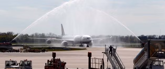 | Một cổng chào bằng nước được dựng lên bằng 2 chiếc xe cứu hỏa để bắt đầu màn chào mừng thầy trò HLV Heynckes |