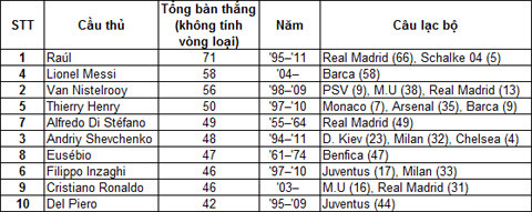 Người đứng đầu trong danh sách những chân sút tốt nhất lịch sử Champions League hiện tại vẫn là huyền thoại Raul Gonzales. "Chúa nhẫn" đang có được 71 bàn thắng, với 66 bàn cho Real Madrid và 5 bàn cho Schalke 04. Tuy nhiên, Messi mới 25 tuổi, chưa đón sinh nhật thứ 26 và nếu tiếp tục duy trì hiệu suất ghi bàn đều đặn, “La Pugla” nhiều khả năng sẽ phá kỷ lục của Raul chỉ trong một hoặc hai mùa giải nữa.