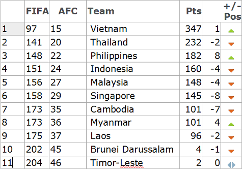 Bảng xếp hạng FIFA tháng 4/2012 khu vực Đông Nam Á