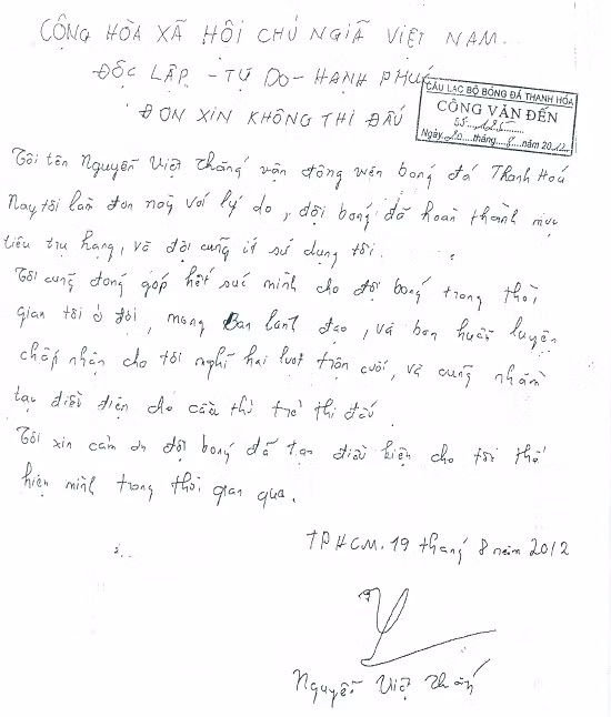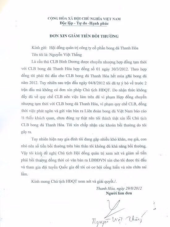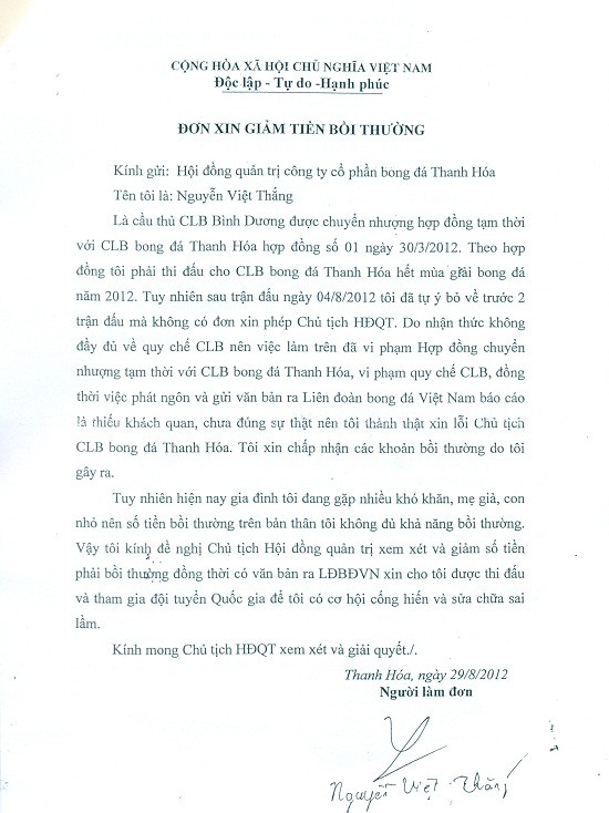 Trong lá đơn “xin không thi đấu” đề ngày 19/08/2012 (tức là hơn 2 tuần rời đội và Thanh Hóa cũng đã có những động thái kiện cầu thủ này lên VFF), Việt Thắng viết “Tôi làm đơn này với lý do đội đã trụ hạng và cũng ít sử dụng tôi”. Chưa nói đến thời điểm viết “đơn xin nghỉ” chỉ là động tác chữa cháy (vì giải đấu đã hết) thì lý do trên không thể nói là thuyết phục với một cầu thủ hưởng thu nhập 300 triệu/tháng.