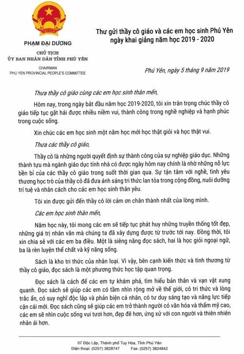 Sau đây là nguyên văn bức thư của Chủ tịch tỉnh Phú Yên gửi thầy cô và học sinh đầu năm học mới.