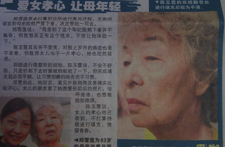 Cô Zeng là người trả tiền cho ca phẫu thuật này. Bà Chen cho biết ca phẫu thuật diễn ra không thoải mái chút nào, có cảm giác như bị kiến cắn. Tuy nhiên, sau khi làm xong,bà Chen rất vui với kết quả thay đổi nhan sắc.