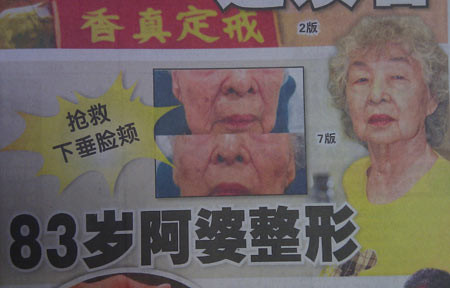 Bà Chen Yuxia (83 tuổi), Singapore đã dành tổng chi phí 5.400 đô la (hơn 100 triệu đồng) phẫu thuật nâng má để khôi phục nhan sắc. Hiếm thấy có ai trong độ tuổi như bà Chen còn đầu tư số tiền lớn đi phẫu thuật thẩm mỹ.