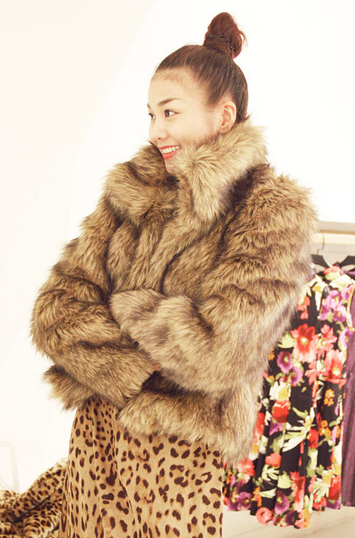 | Đôi khi cô cũng thật năng động và trẻ trung với áo khoác da cổ lông sành điệu |
