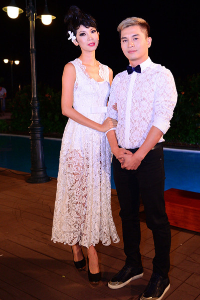 | Vĩnh Thụy trên sàn diễn còn mặc váy, áo xuyên thấu, đối lập với vẻ manly ngoài đời |