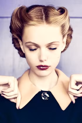 Để kiểu đầu không bị cũ kĩ bạn nên mặc tóc hơi lung tung một chút. Các lọn xoăn được cố định nhưng không quá cứng, mà vẫn mang vẻ gợi cảm của Hollywood thập niên 40.