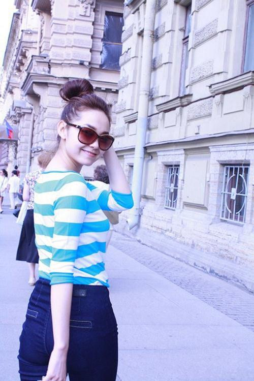 Minh Hằng trẻ trung với áo tay lỡ và chân váy sọc xanh