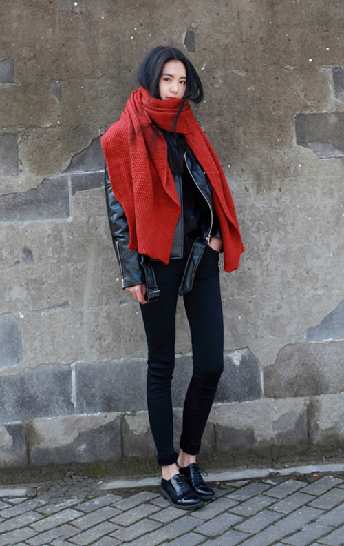 Nên: Với kiểu quàng khăn một vòng đơn giản bạn nên chọn khăn có gam màu trơn thật nổi. Và sau đó kết hợp nó với áo màu tối ví dụ như đen và đỏ. Với sự kết hợp màu sắc này làn da của bạn sẽ trở nên sáng hơn.