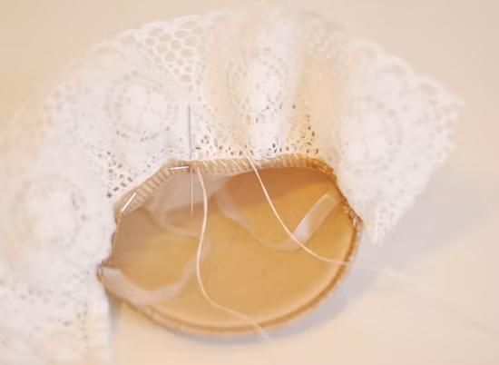 Đầu tiên, bạn dùng kim làm dấu đính ren vào miệng tất.
