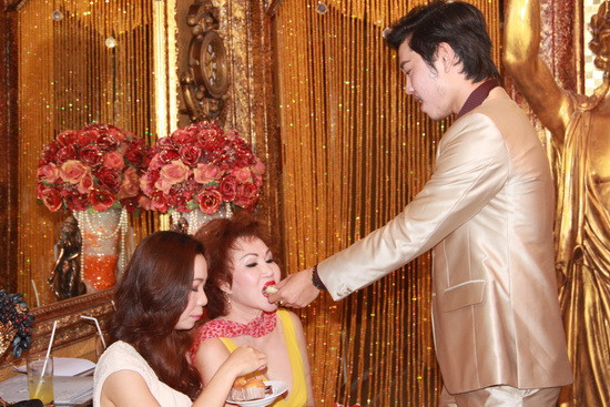 | Cùng xuất hiện với một người phụ nữ áo vàng, song có điều cô gái bên cạnh Lý Hùng chỉ độ tuổi 20, còn người phụ nữ váy vàng bên cạnh Vũ Hoàng Việt đã U60 mất rồi. |