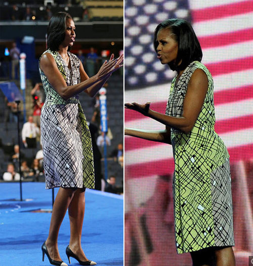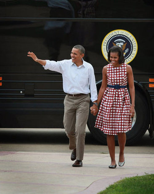 | Váy Moschino của bà Michelle khi vân động tranh cử tại bang Miami. Đây là chiếc váy bà tận dụng lại. Lần đầu tiên bà mặc nó là vài tháng 8/2008 cũng trong cuộc vận động tranh cử nhiệm kỳ đầu tiên của Barack Obama |