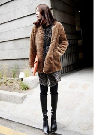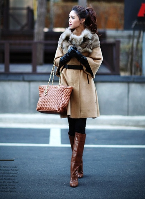 | Boot cao cổ màu nâu sáng mix với áo khoác lông và quần legging, cô ấy trông thật tuyệt phải không? |