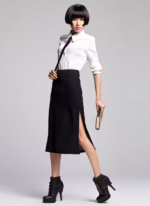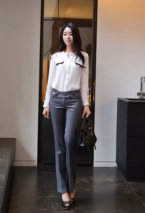 - Mặc quần, váy có cạp cao (đai cao) hay sử dụng thắt lưng làm điểm nhấn phần eo trên sẽ giúp cho phần thân, lưng ngắn lại và phần chân dài hơn.