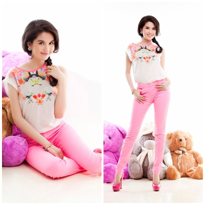| Gam màu hồng mang đến cho Ngọc Trinh sự dịu dàng, đáng yêu và trẻ trung phù hợp với lứa tuổi |