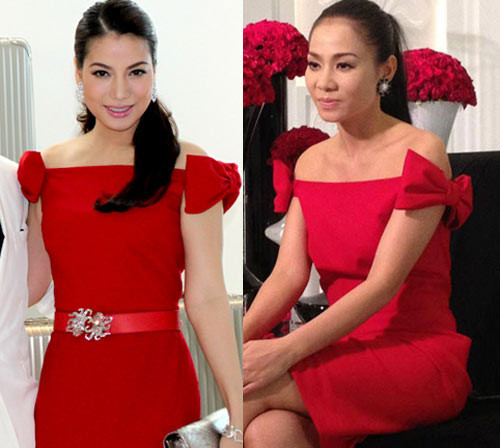 | Hai người đẹp Thu Minh và Trương Ngọc Ánh cùng đụng hàng chiếc váy đỏ gợi cảm với phần tay được cách điệu thành hình nơ xinh |