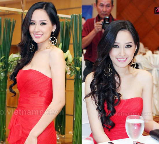 | Thu Thủy trong bộ váy đỏ nổi bật cùng khuyên tai nhọn lạ mắt. |
