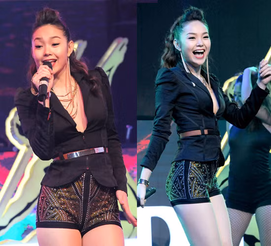 | Vy Oanh nổi bật với áo vàng quây khoe ngực tròn đầy và diện hoa tai tròn ngoại cỡ. |