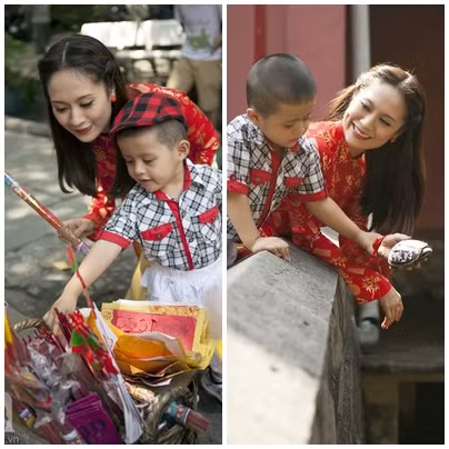 | Mẹ con Kim Hiền rạng rỡ nơi cửa Phật với chiếc áo dài điểm hoa tím li ti |