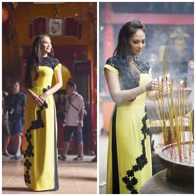| Một chiếc áo dài khác được Hồ Ngọc Hà mặc lên chùa. |