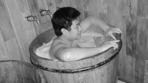 Vừa bước qua cánh cửa tự động, chúng tôi được chào đòn bằng nụ cười ấm áp từ cô tiếp viên trẻ trung xinh đẹp. Không phải chờ đợi quá lâu, một cô tiếp viên “chân dài tới nách” với chồng khăn tắm trên tay dẫn chúng tôi vào một căn phòng được thiết kế hoàn toàn tự nhiên bằng gỗ pơ mu; trần nhà bằng gỗ pơ mu, cửa bằng gỗ pơ mu và chiếc bồn tắm cũng là pơ mu.