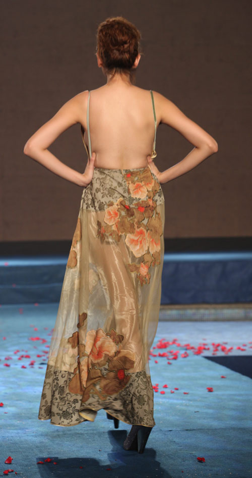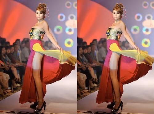 | Trong đêm thời trang "Đam mê và hội tụ" diễn ra ngày 20/12, siêu mẫu Hoàng Yến đã gây 'gây sốc' cho khán giả bởi chiếc váy màu cam với những khoảng hở 'nhức mắt' và phản cảm thế này. |