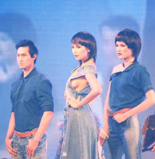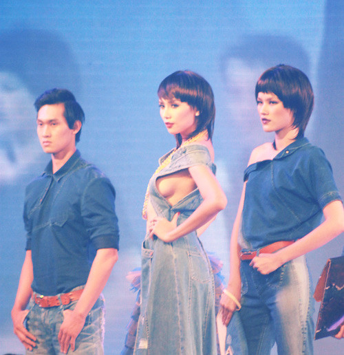 | Trong màn trình diễn thời trang đầu tiên của chương trình "Fashion Boulevard 2" (19/7), Hoàng Yến cũng 'liều lĩnh' mắc lỗi trình diễn tương tự với chiếc váy jeans hở hang lộ liễu . |