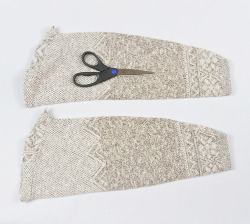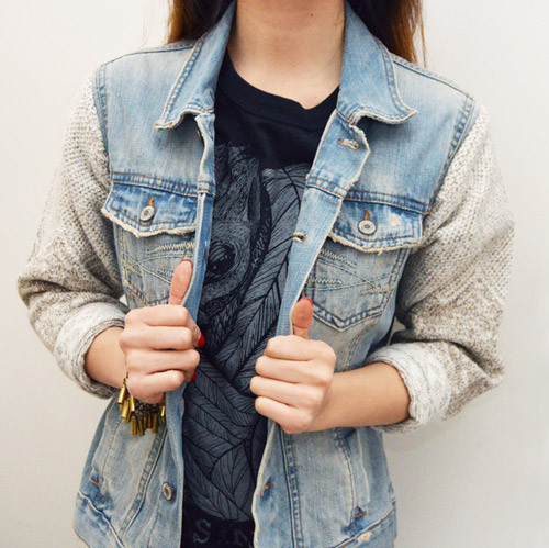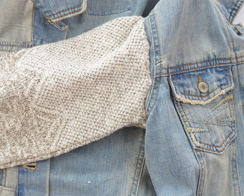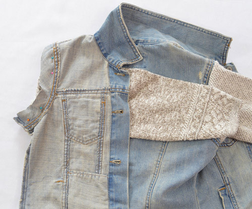 Chú ý: Khi cắt tay của áo khoác denim, bạn nên để lại một khoảng 3 cm so với đường viền vai áo. Tương tự với tay áo len, bạn cũng nên chừa ra 3 cm, đây sẽ là phần để nối giữa tay áo len và thân áo denim.