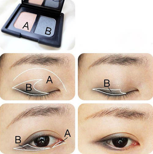 Cũng như các bước thông thường, đầu tiên, bạn cần dùng kem che khuyết điểm thoa đều lên bầu mắt, bọng mắt để làm sáng da. Sau đó, dùng cọ tán màu nude lên vùng da có ký hiệu A và màu đen lên vùng B. Bạn nên dùng cọ có đầu lông dẹt thay vì có có đầu mút để màu sắc được tán mỏng và đều. Lưu ý không dùng quá nhiều màu đen sẽ khiến cho mắt có cảm giác thâm quầng như mất ngủ.