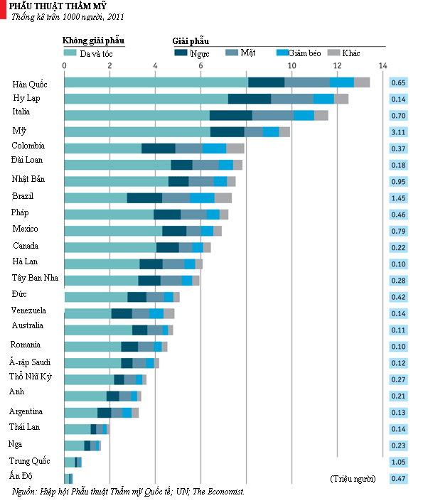 Mỹ được xem là quê hương của phẫu thuật thẩm mỹ hơn bất cứ nơi nào trên thế giới, song lượng người dùng dịch vụ này lại là một câu chuyện khác. Nếu tính toán trên lượng người sử dụng dịch vụ này, thì Hàn Quốc, Hy Lạp và Italia là những quốc gia có lượng người phẫu thuật thẩm mỹ cao nhất.