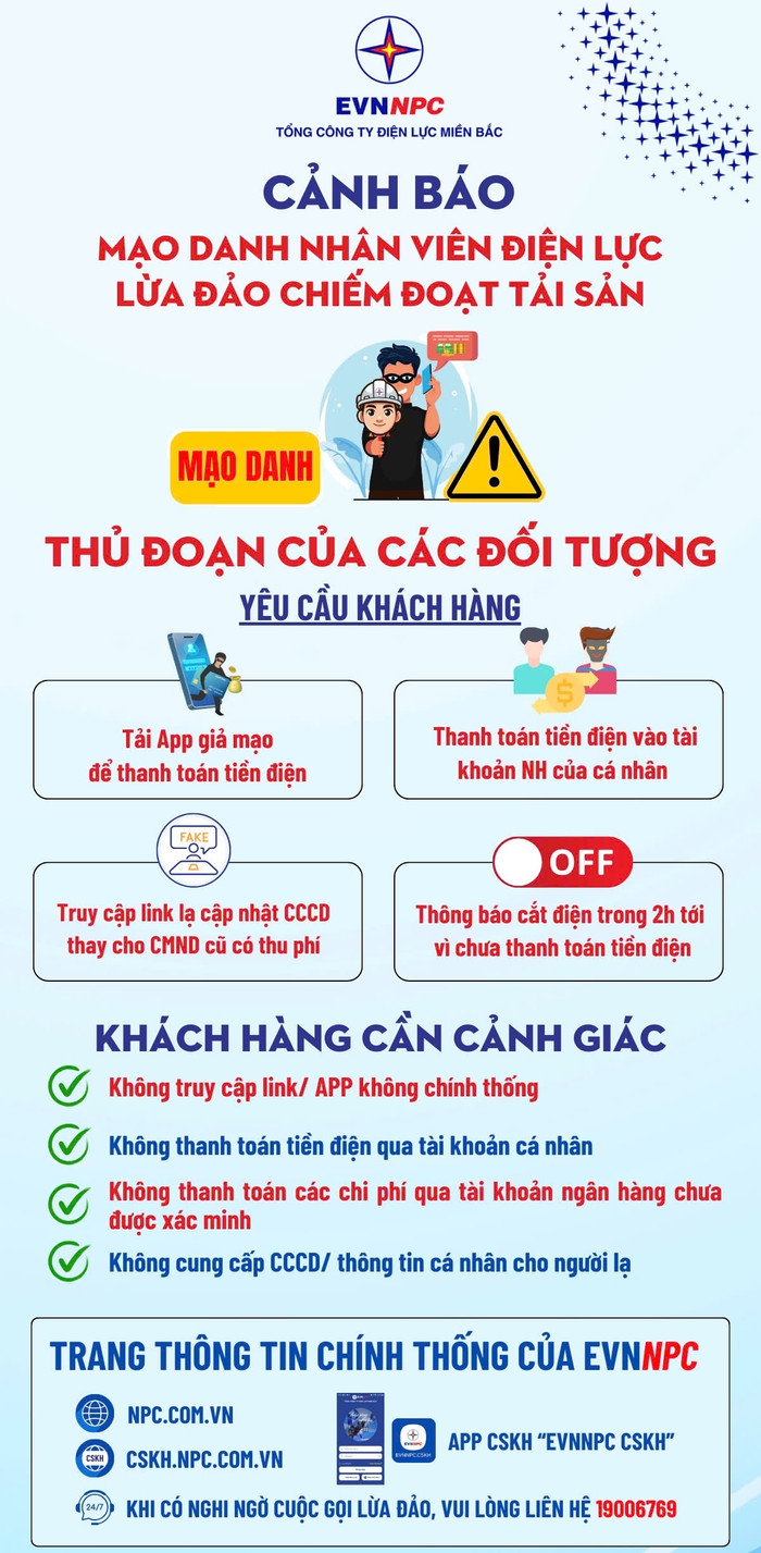 Tổng công ty Điện lực miền Bắc (EVNNPC) khuyến cáo khách hàng nâng cao cảnh giác với những cuộc gọi tự xưng là nhân viên điện lực nhằm thực hiện hành vi lừa đảo chiếm đoạt tài sản của khách hàng, gây ảnh hưởng tới uy tín của ngành điện.