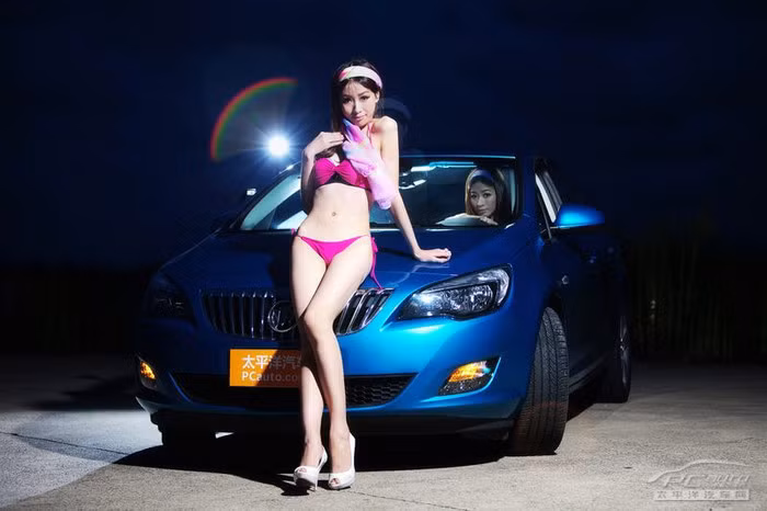 (GDVN) - Cặp người mẫu song sinh khoe đôi chân dài và những đường cong quyến rũ bên chiếc siêu xe Buick màu xanh tươi trẻ.