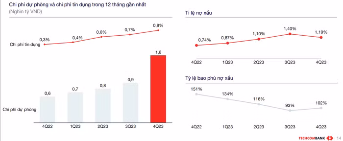 “Năm 2023 với nhiều thách thức nhưng tỷ lệ nợ xấu của nhà băng đến cuối 2023 là 1,19%, thấp hơn nhiều so với mục tiêu 1,5% đề ra. Đây cũng là tỷ lệ nợ xấu thuộc nhóm thấp nhất ngành, trong khi Techcombank luôn trích lập chi phí dự phòng rủi ro một cách thận trọng và an toàn nhất”, ông Tuấn nhấn mạnh.
