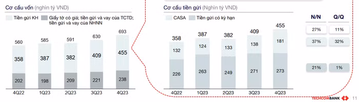 Đặc biệt, tỷ lệ tiền gửi không kỳ hạn trên tổng huy động (CASA) của Techcombank sau giai đoạn đi xuống theo diễn biến chung của thị trường, cũng đã phục hồi mạnh từ quý 3/2023. Hết năm 2023, CASA của Techcombank lên gần 40%, so với mức 33,6% vào cuối quý 3 và được lãnh đạo nhà băng dự báo tiếp tục cải thiện trong năm nay.