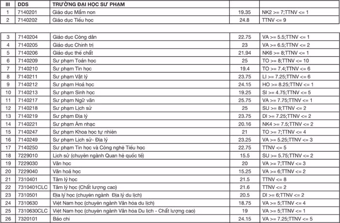 Có hai ngành sư phạm lấy điểm chuẩn cao nhất là Sư phạm Ngữ văn và Sư phạm Lịch sử tại tổ hợp C00 (Văn, Sử, Địa), lấy 28,5 điểm. Điểm trúng tuyển ngành Sư phạm Âm nhạc thấp nhất là 18,38 điểm.