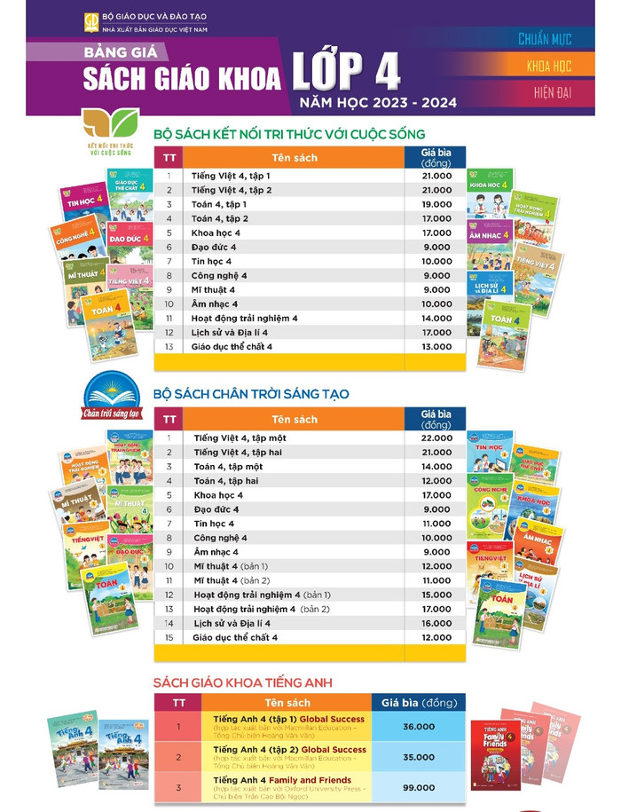 Theo đó, sách giáo khoa lớp 4 bộ Kết nối tri thức với cuộc sống gồm 13 đầu sách, có giá là 186.000 đồng (chưa bao gồm sách tiếng Anh); bộ Chân trời sáng tạo có giá là 182.000 đồng (chưa bao gồm sách tiếng Anh).