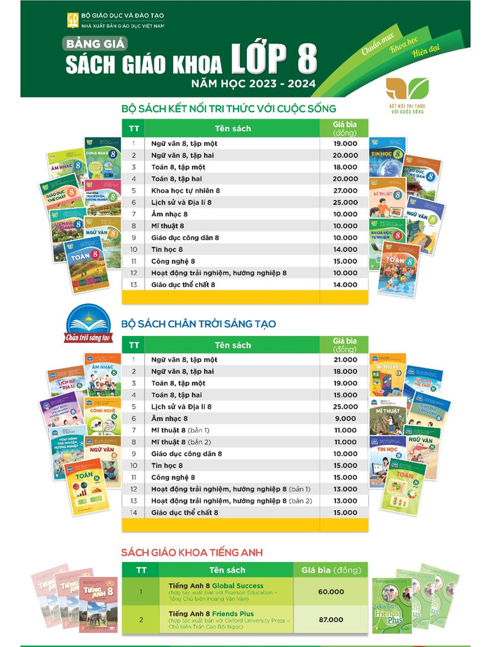 Với sách giáo khoa lớp 8, bộ Kết nối tri thức với cuộc sống có giá 212.000 đồng (chưa bao gồm sách tiếng Anh); bộ Chân trời sáng tạo có giá là 186.000 đồng (chưa bao gồm sách tiếng Anh).