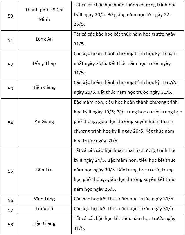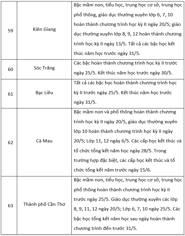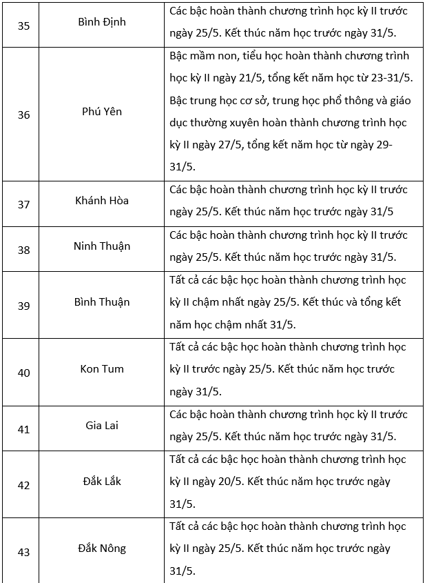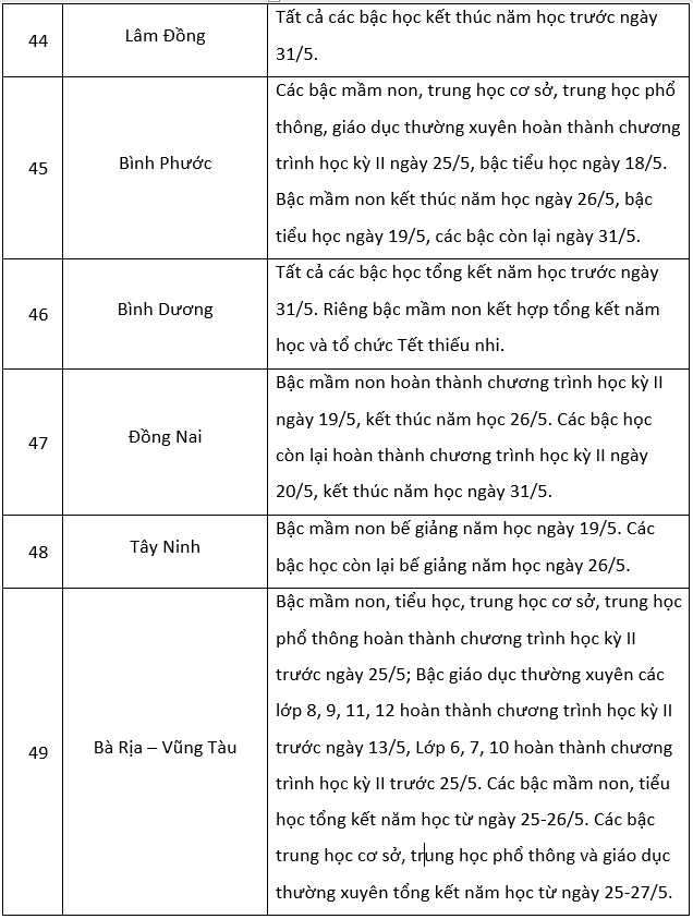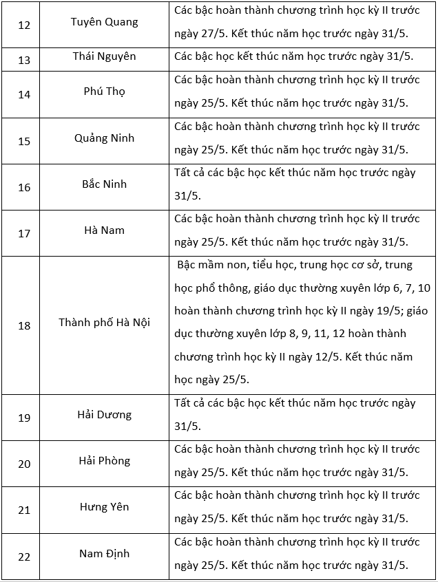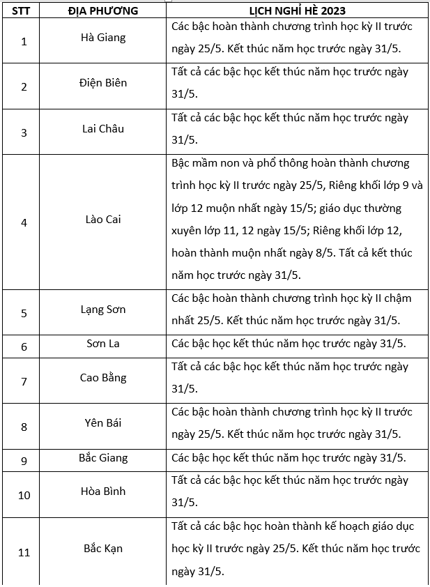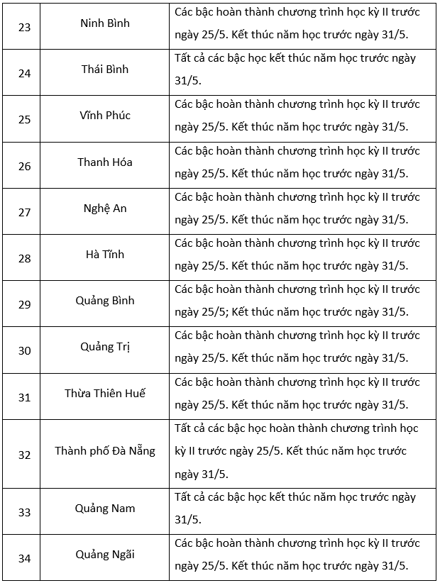 Theo khung kế hoạch thời gian năm học 2022-2023 đối với giáo dục mầm non, giáo dục phổ thông và giáo dục thường xuyên do Bộ Giáo dục và Đào tạo ban hành, thời gian hoàn thành kế hoạch giáo dục học kỳ II trước ngày 25/5/2023 và kết thúc năm học trước ngày 31/5/2023.