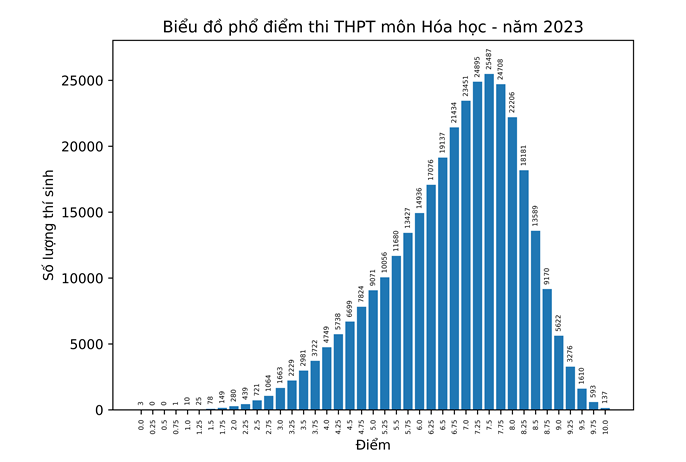 Kết quả phân tích phổ điểm thi tốt nghiệp môn Hóa học của cả nước năm 2023 cho thấy: Có 328,117 thí sinh tham gia thi bài thi Hóa học, trong đó điểm trung bình là 6.74 điểm, điểm trung vị là 7.0 điểm; điểm số có nhiều thí sinh đạt nhất là 7.5 điểm. Số thí sinh có điểm <= 1 là 14 (chiếm tỷ lệ 0.004%); số thí sinh đạt điểm dưới trung bình là 38,375 (chiếm tỷ lệ 11.7%).